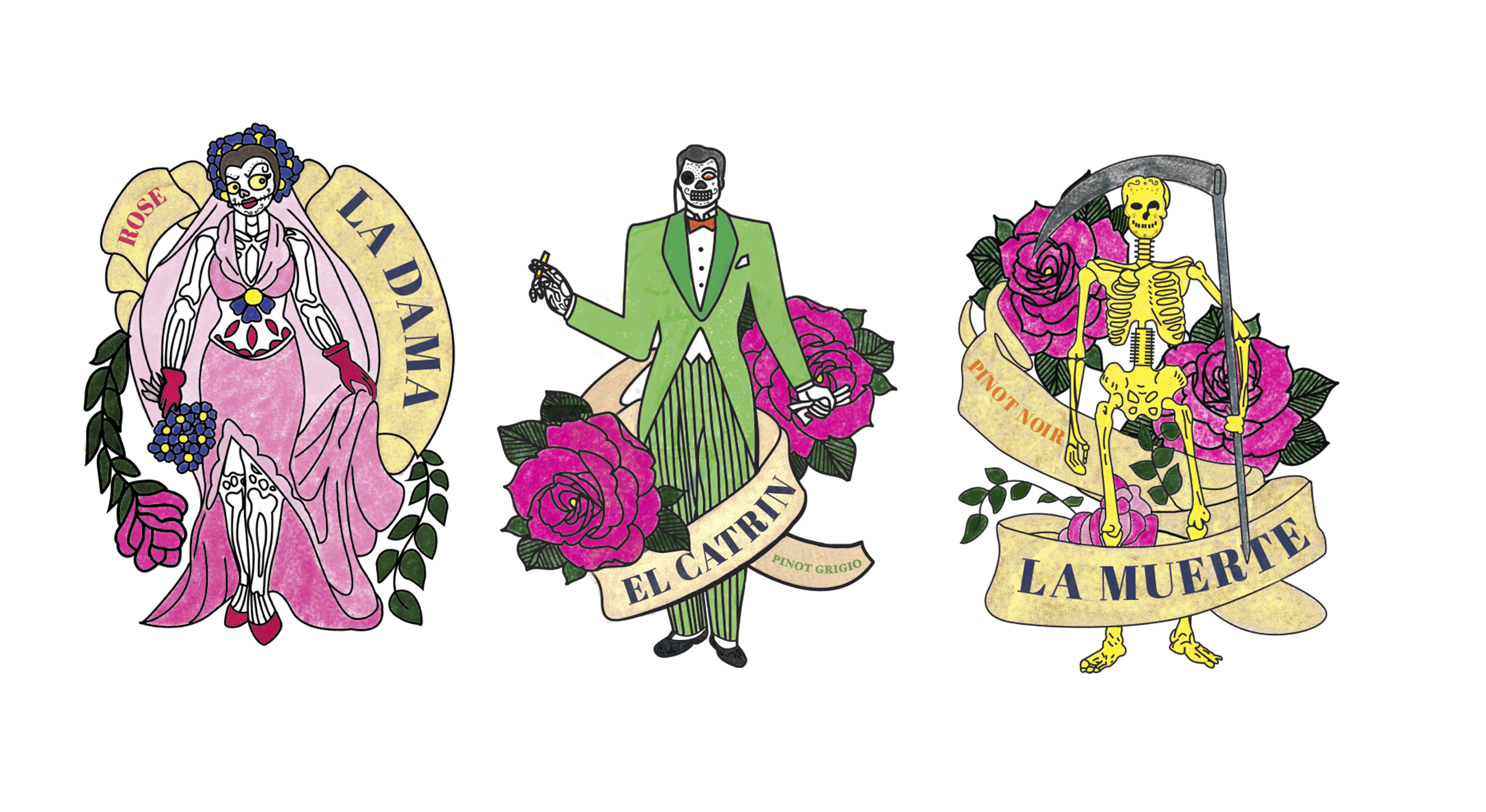 This design is based on the Loteria game from México. The illustrations give the labels a fun and playful look and feel. The name Hades references the king of the underworld, and the label images symbolize el día de los muertos.